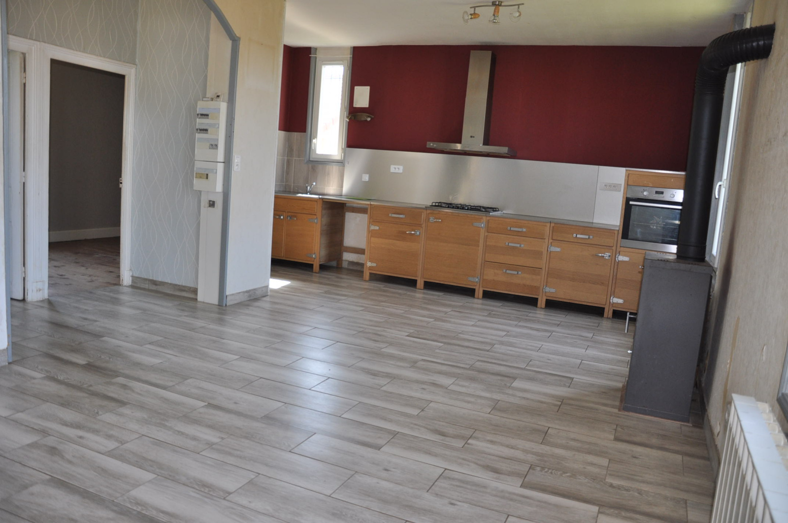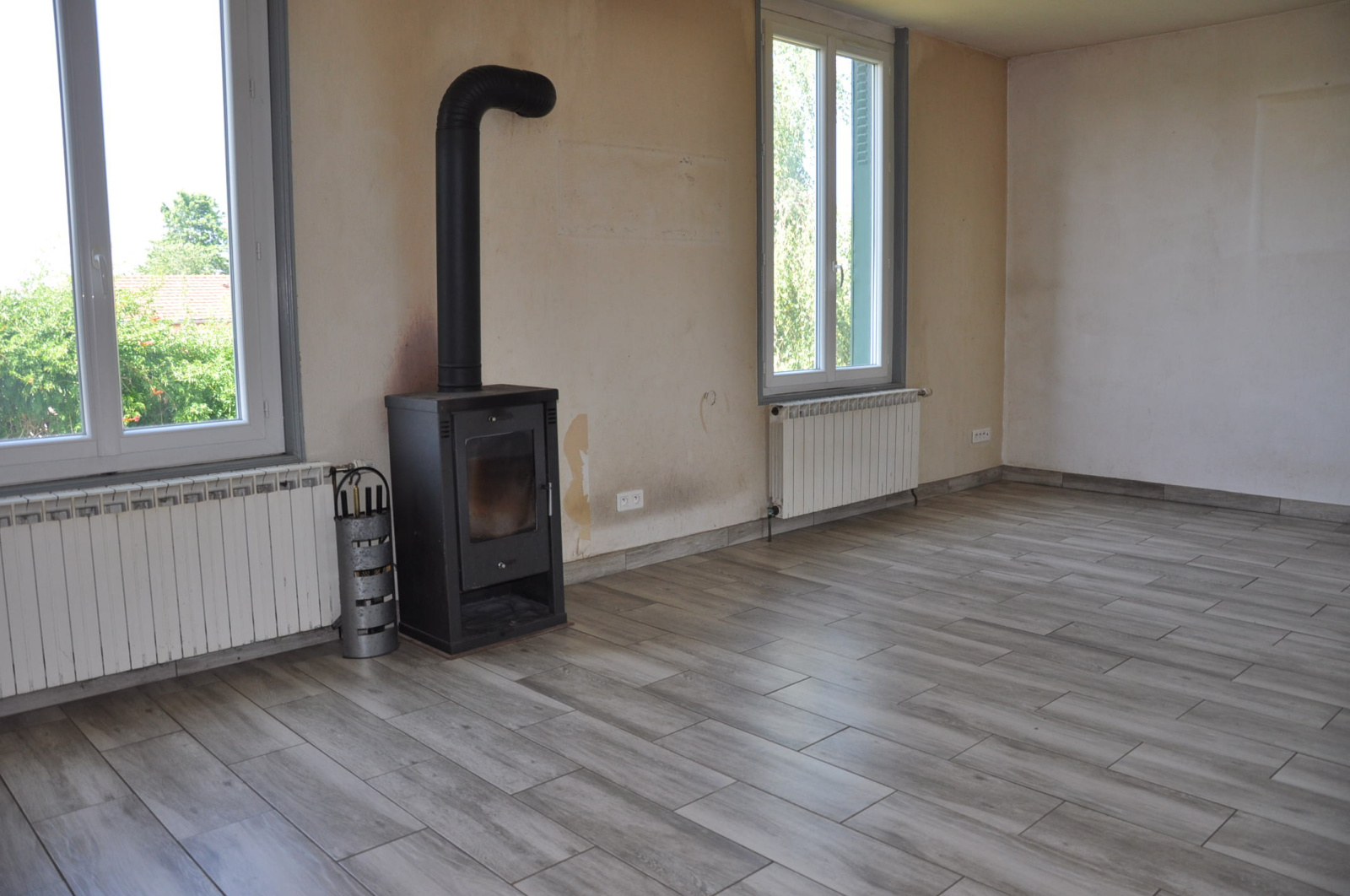 Fenêtres en PVC avec double vitrage. Chauffage central au gaz de ville (2022) + poêle à bois. Tout à l’égout.