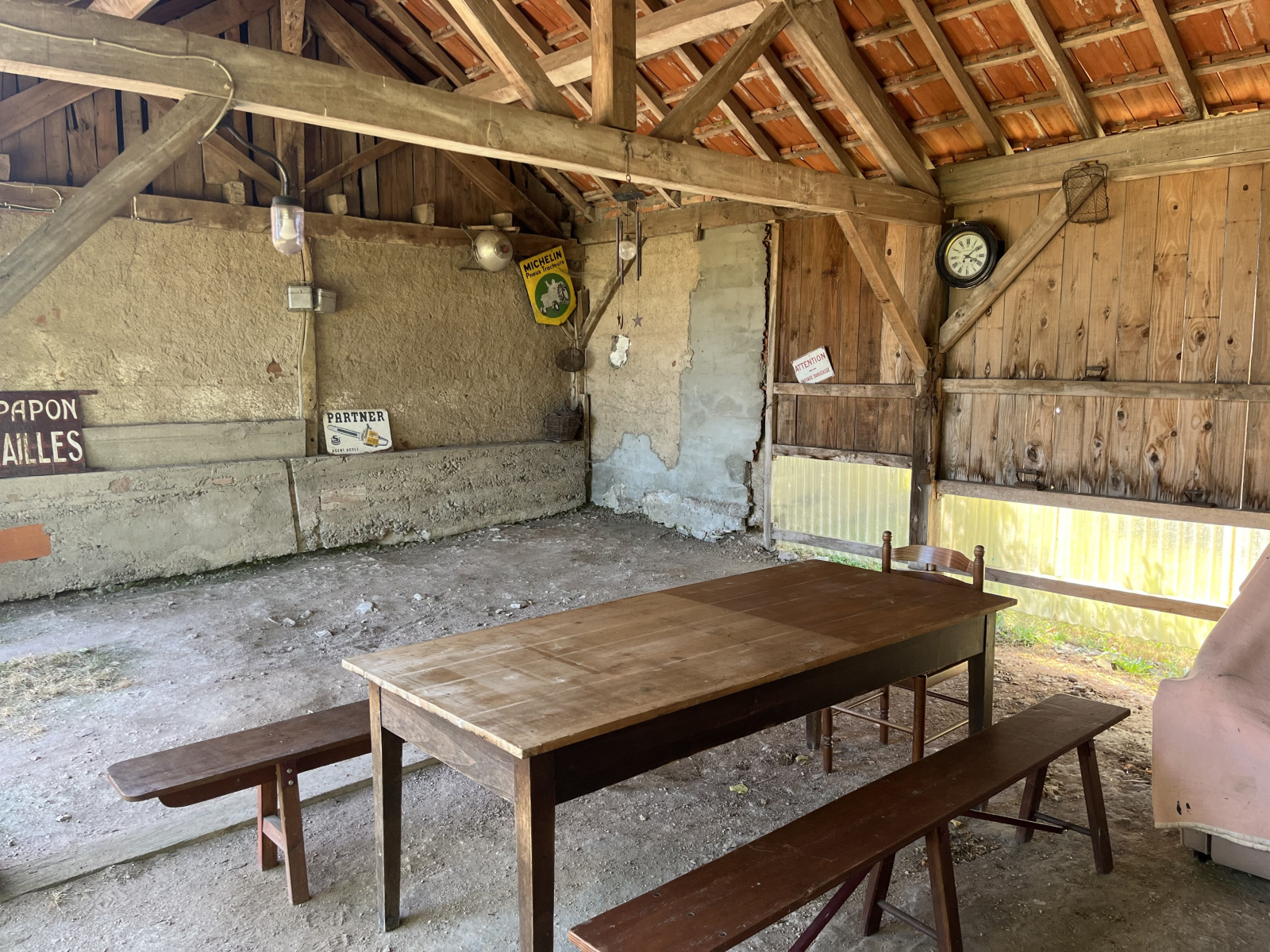 Grange de 76 m² au sol et écuries de 20 m², attenantes à la maison. Atelier. Abri de voiture de 35 m². Petite dépendance et soues à cochons.