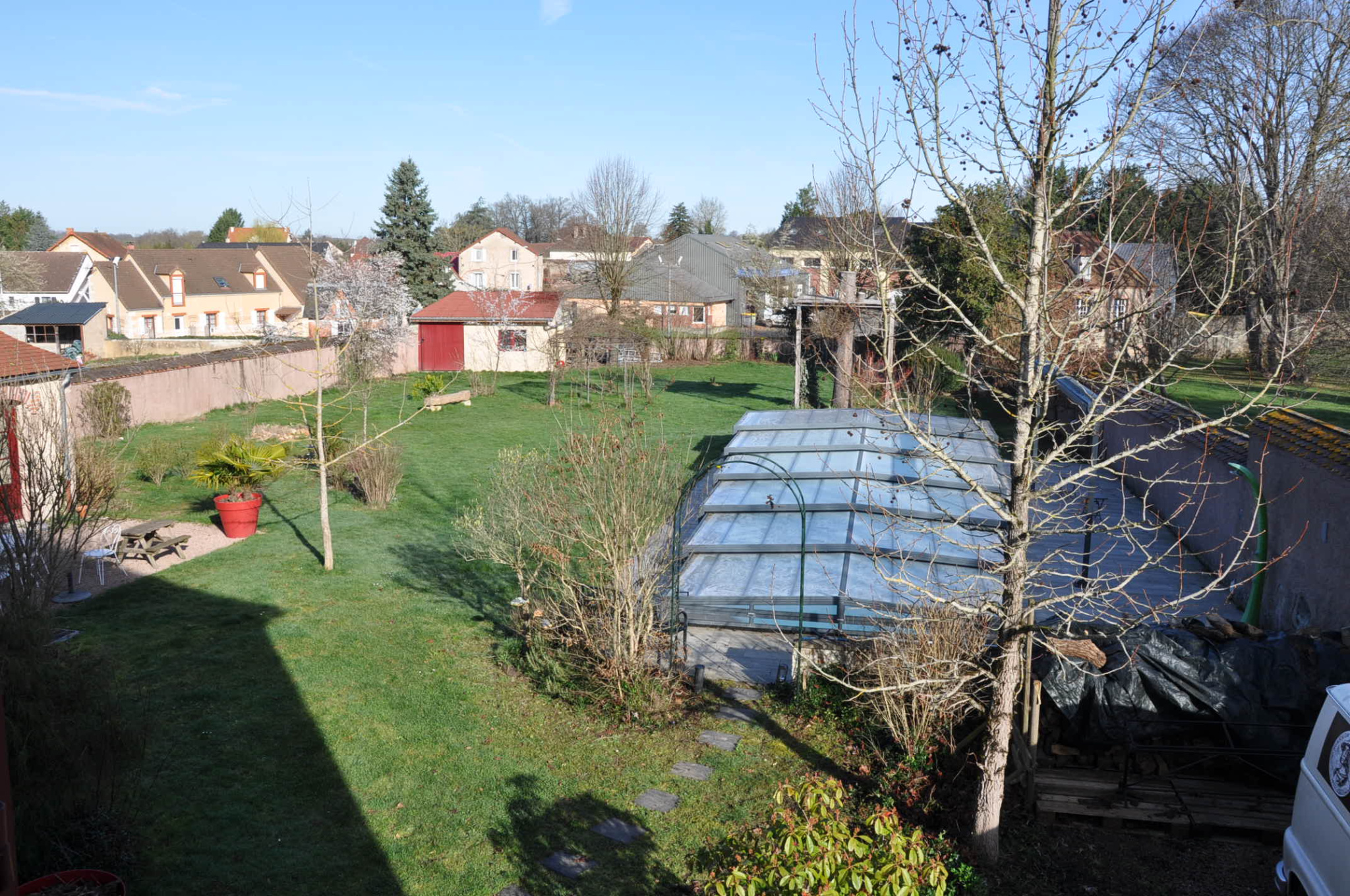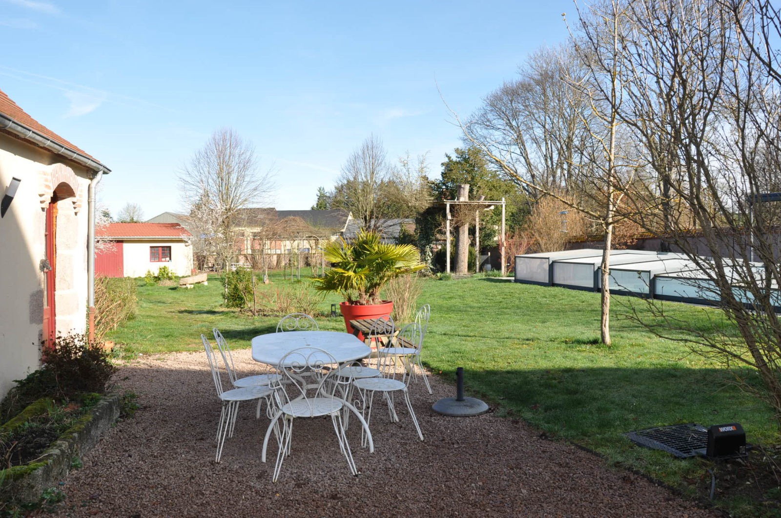 Une cour fermée et sécurisée devant, avec une borne de recharge électrique, et un parking pour 4 voitures, accueillent les amis ou les clients. Un passage sur le côté permet l'accés à l'arrière de la propriété, endroit où se dessine un espace caché, clos de murs, sans vis-à-vis, avec une piscine de 11 m X 4,20 m (avec un dôme sécurisant et conservant la chaleur), un paisible jardin d'agrément et de détente, et un abri de jardin récent de 18 m².