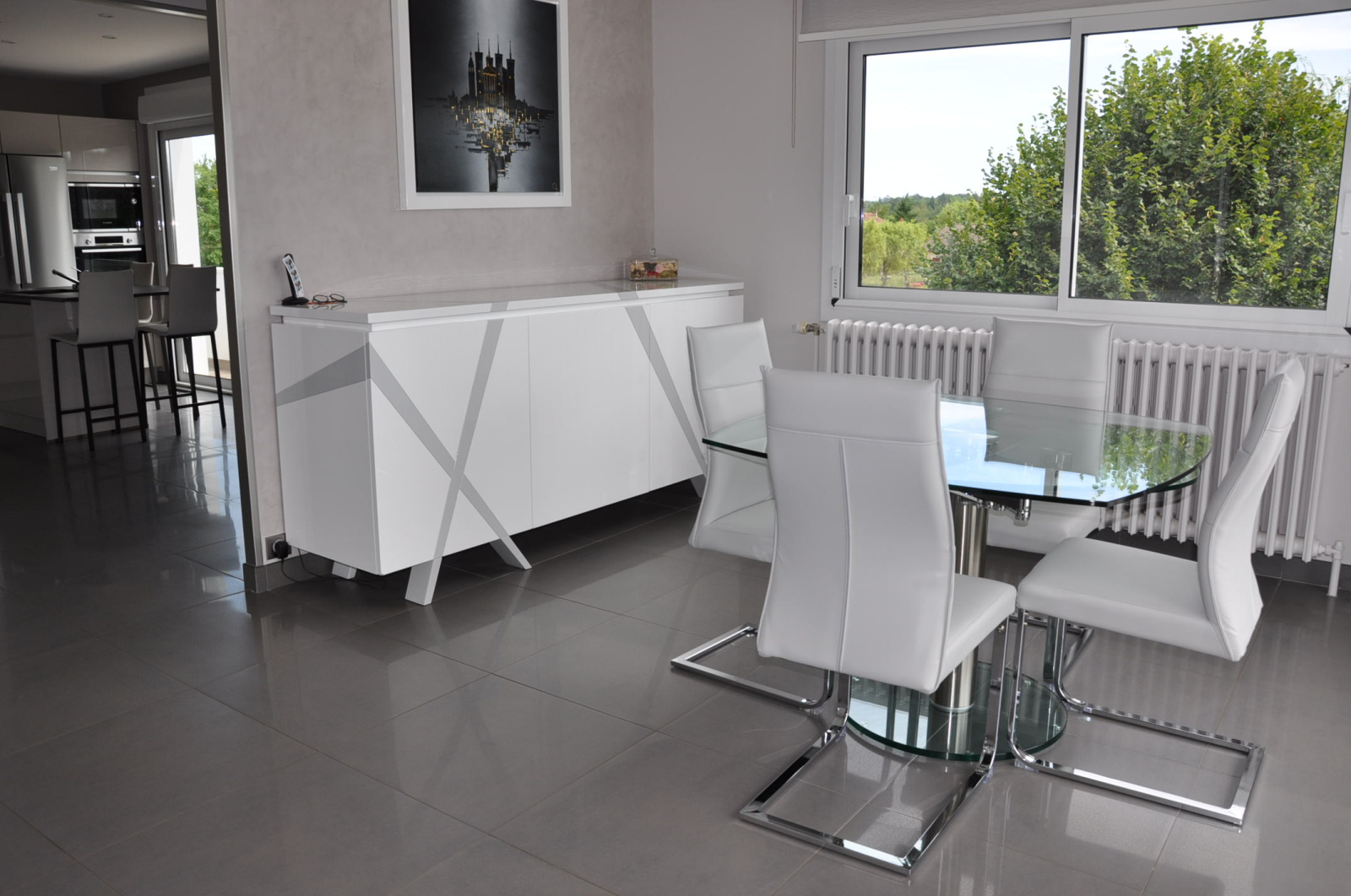 À LAPALISSE, dans un quartier résidentiel très calme, superbe villa rénovée dans un style contemporain, comprenant au rez-de-chaussée une salle de jeux de 24 m², avec baies vitrées, un bureau de 10 m², avec placards, une cuisine d’été de 11 m², une chaufferie, une belle chambre de 23 m² avec dressing, une salle d’eau de 4 m², avec WC, un grand garage de 35 m², carrelé, avec double portes automatisés, une cave à vins, climatisée (température constante), et un cellier, à l’étage, une entrée de 8 m², avec placards, un salon–salle à manger de 27 m², très lumineux et traversant avec deux baies vitrées et deux fenêtres, donnant sur un balcon, une magnifique cuisine aménagée et équipée (plaque, hotte, four, lave-vaisselle et frigo américain) de 12 m², avec ilot central, plan de travail en pierre reconstituée, et baie vitrée donnant sur une terrasse de 60 m² avec pergola, un couloir desservant deux chambres de 11 m², avec placards aménagés, une salle d’eau contemporaine de 5 m² et un WC.