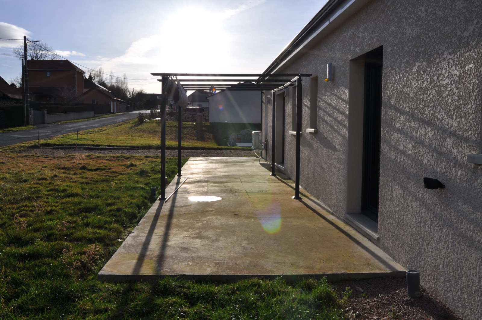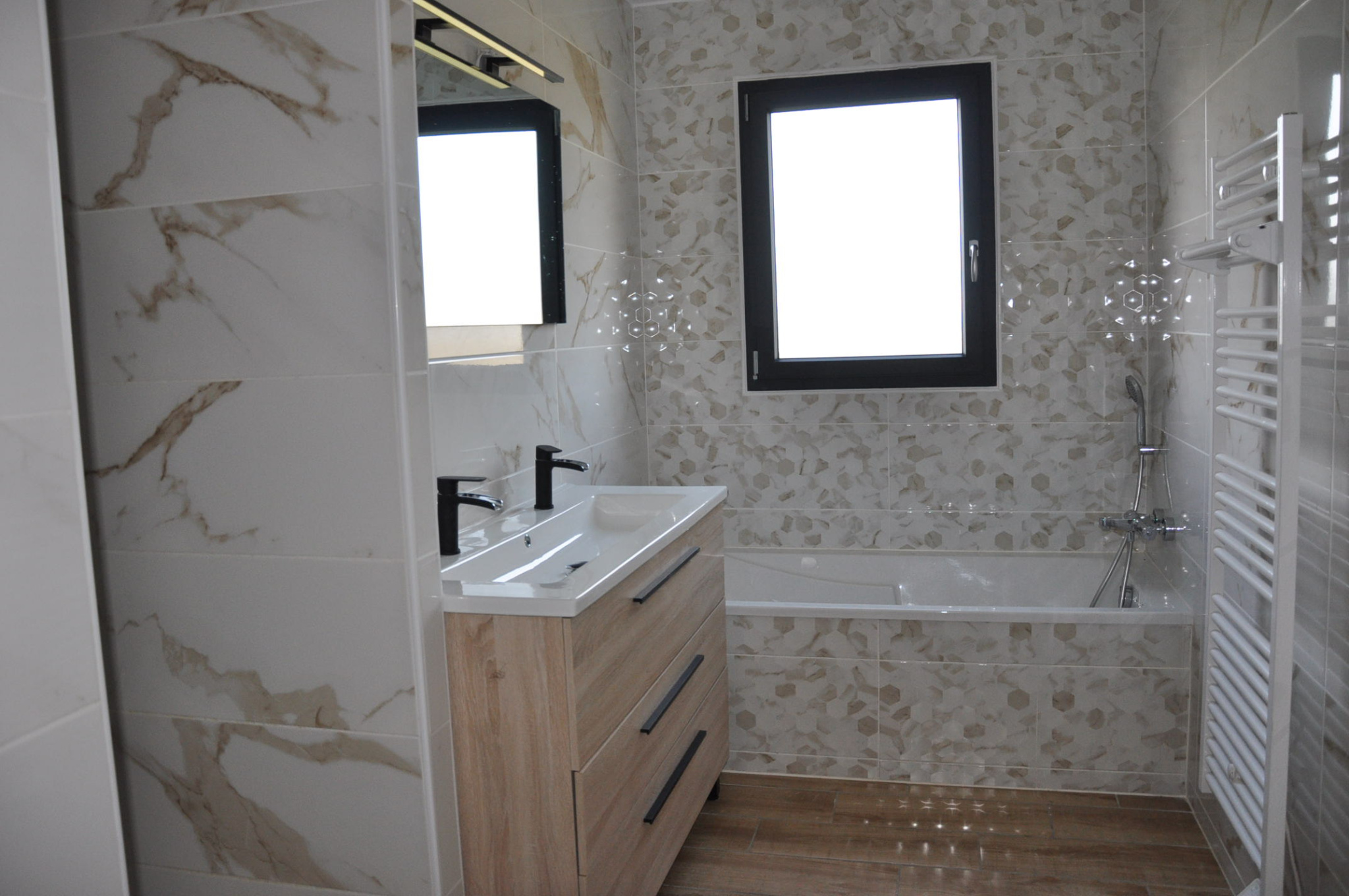 Baies vitrées en aluminium et fenêtres en PVC et volants roulants. Chauffage au sol par pompe à chaleur. Tout à l’égout.