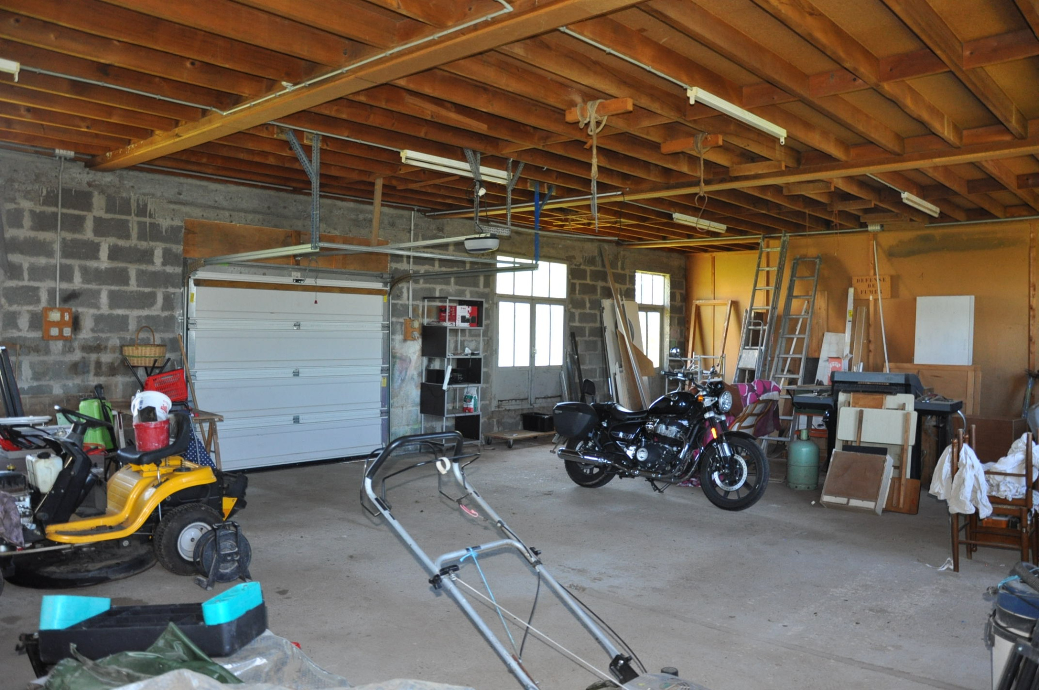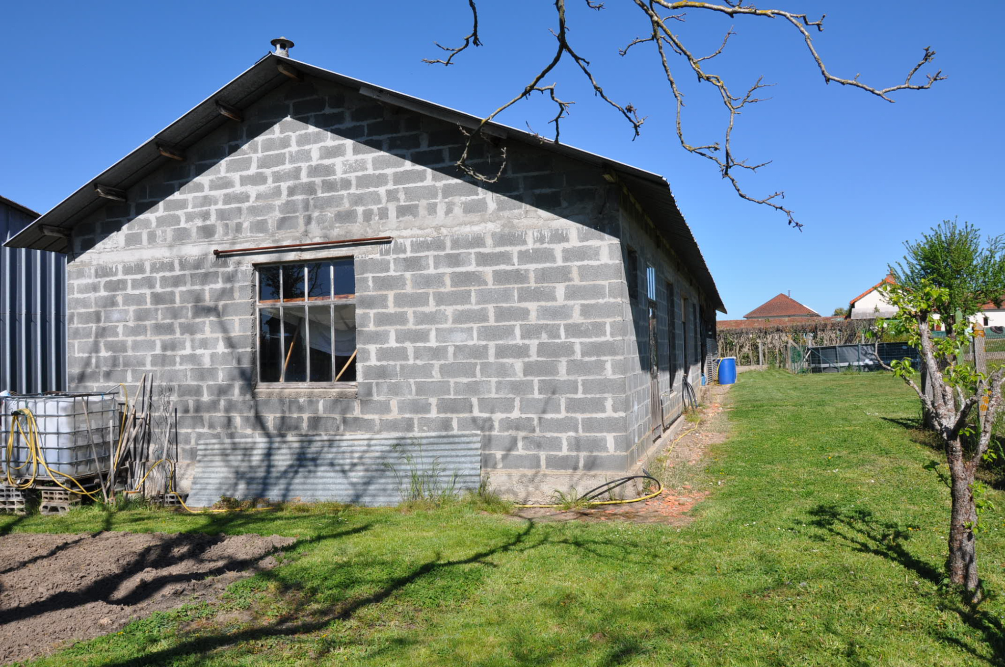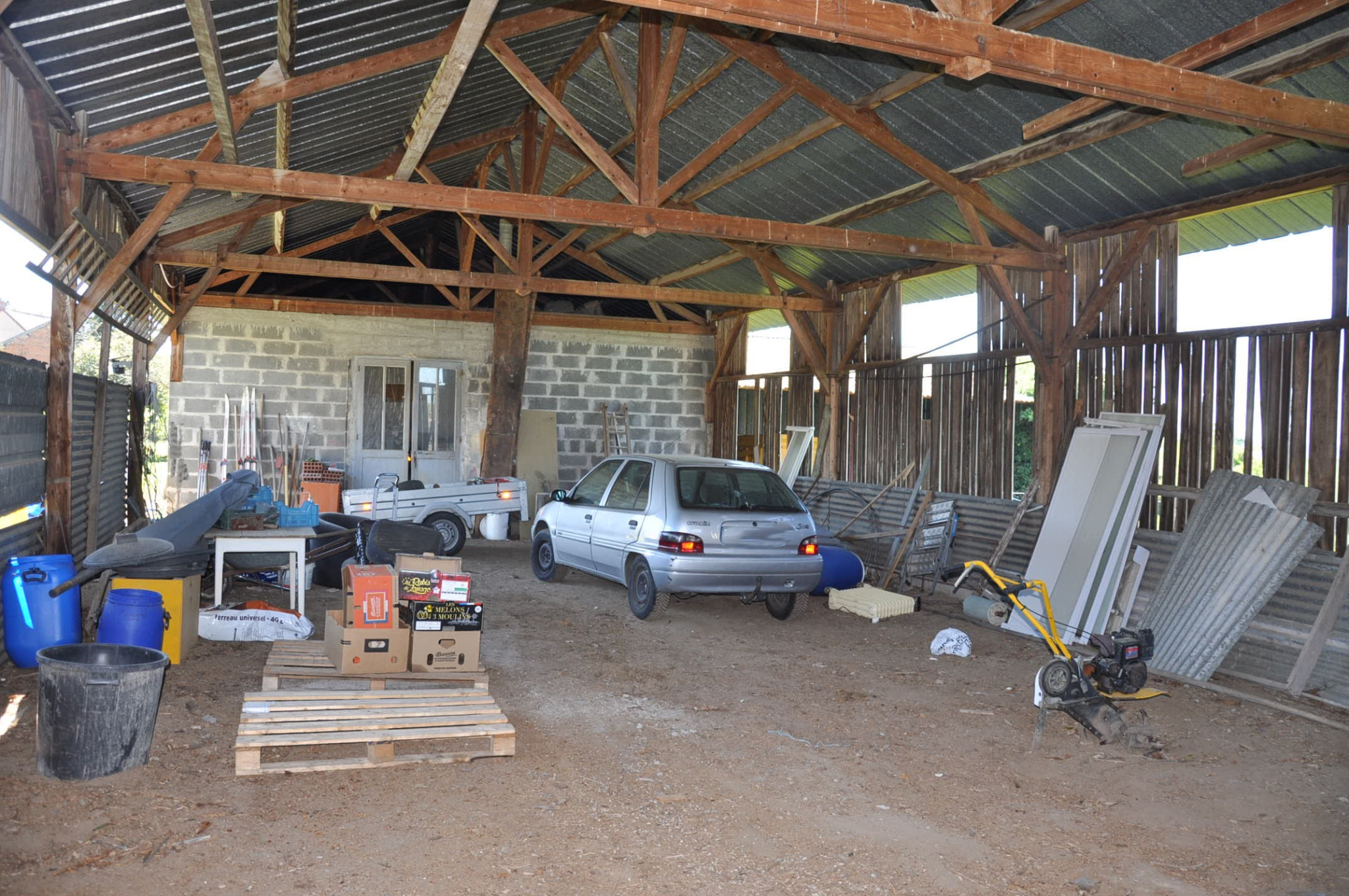 Belle dépendance au fond du terrain, divisée en un préau de 125 m² sur terre battue et un atelier fermé de 120 m² sur dalle béton, avec une porte sectionnelle automatisée.