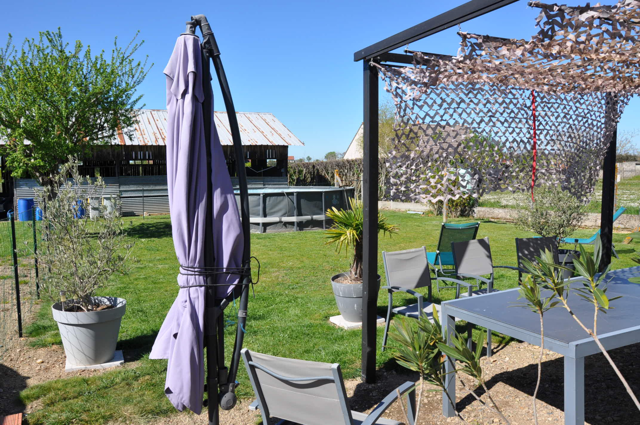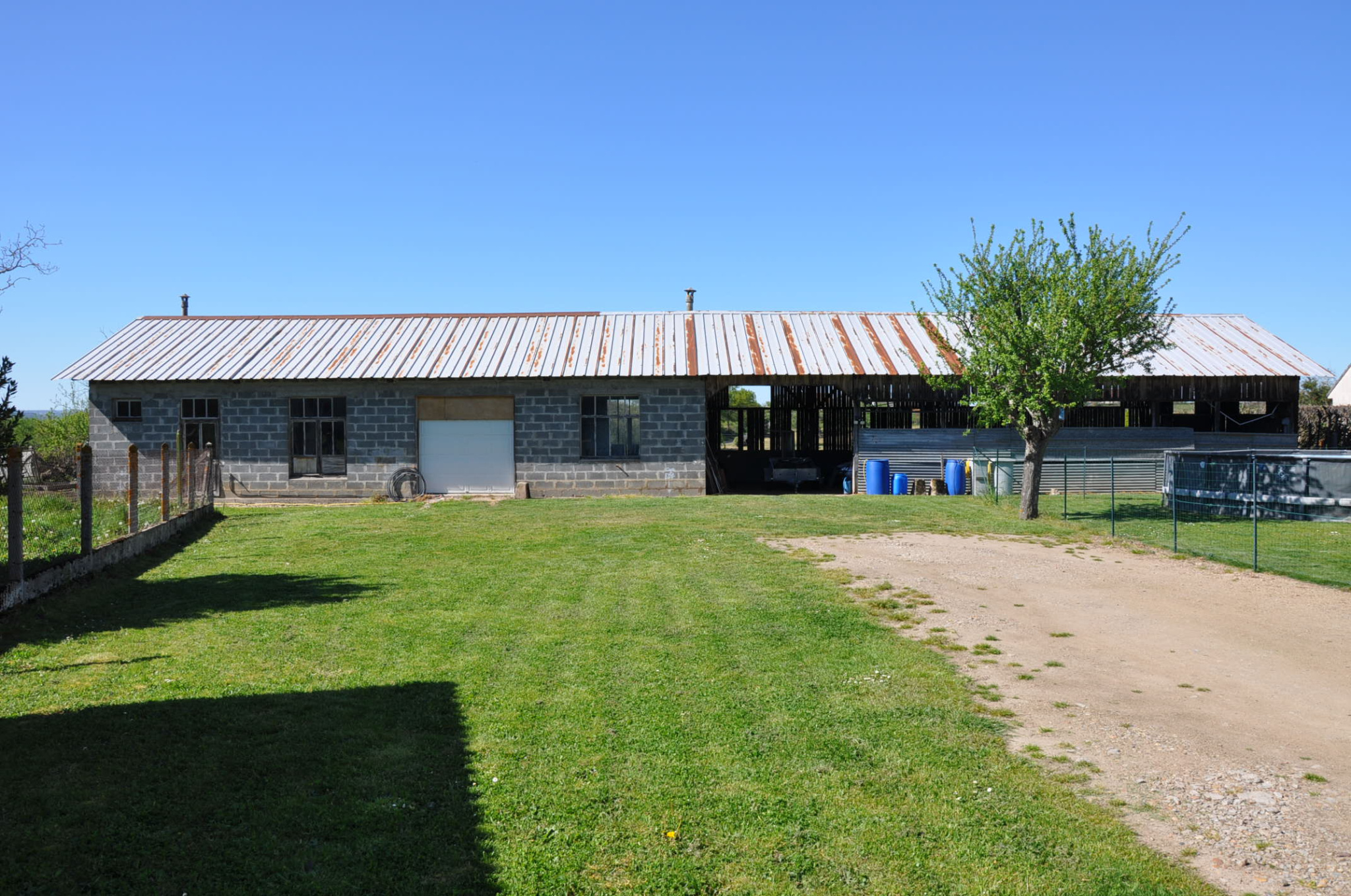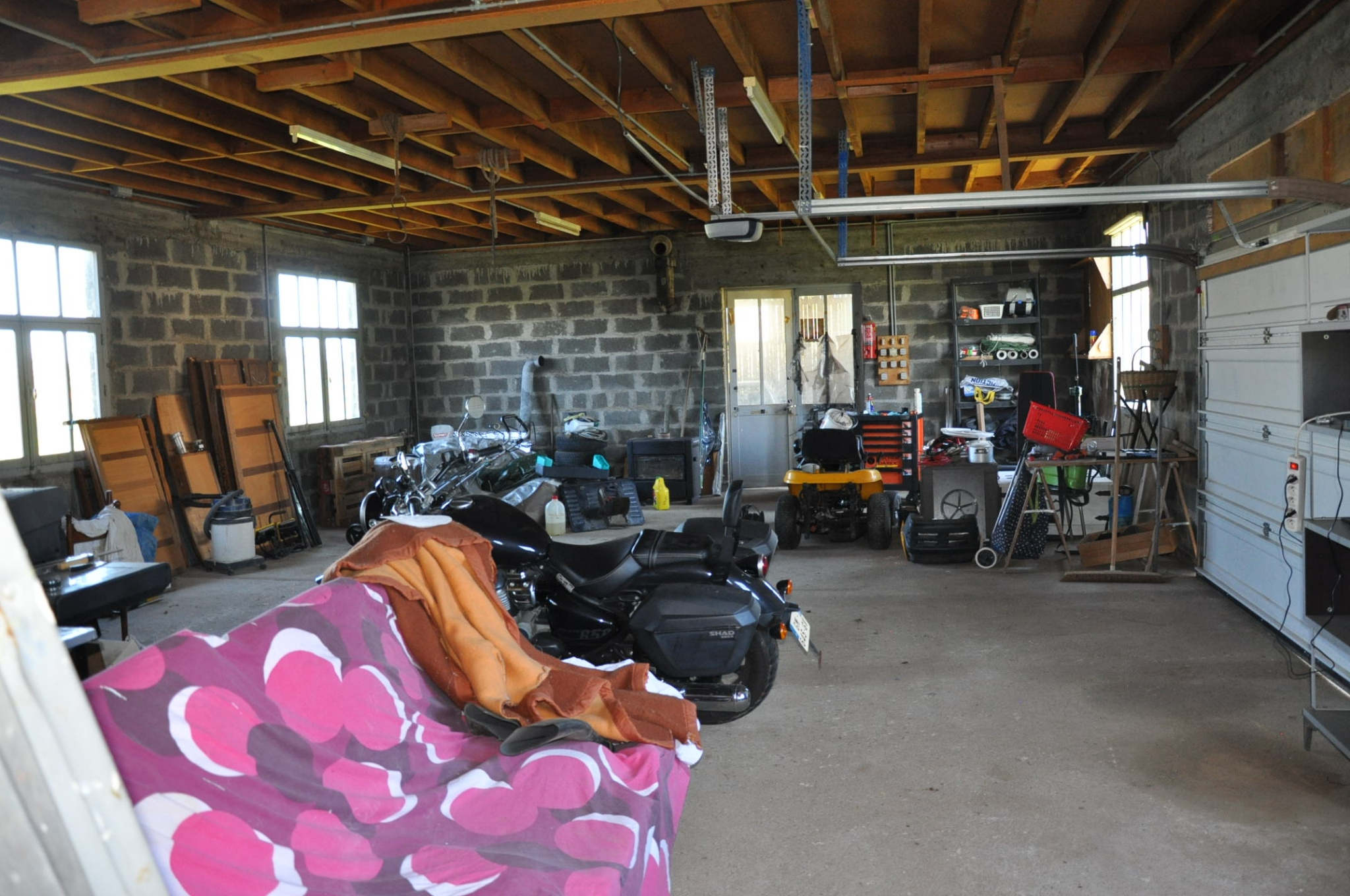 Belle dépendance au fond du terrain, divisée en un préau de 125 m² sur terre battue et un atelier fermé de 120 m² sur dalle béton, avec une porte sectionnelle automatisée.